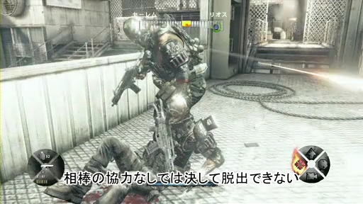 本作では,主人公と相棒の二人で軍隊として行動するので,当然ながら常に二人同時プレイでしか遊べない。オンラインに接続していれば,フレンドや見知らぬ人が相棒になってくれるわけだ。もしも自宅に二つのコントローラ(と二人のプレイヤー)がいれば,肩を並べて共闘することも可能だ。