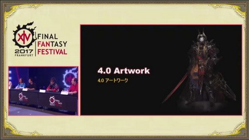 さらに同日に行われたトークセッションの「開発パネル〜The Art of Eorzea〜」では,リードキャラクターコンセプトアーティストの茂木雄介氏が登壇。アートチームの制作秘話などを披露した。なお,吉田氏によると,着ている侍のコスチュームは侍のジョブ専用装備で,茂木氏がデザインしたとのことだ。