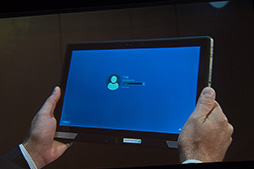 ステージでは,Windows 10をインストールしたRealSense搭載タブレットを使って,顔認証で素早くWindowsにログオンするというデモが披露された。RealSenseによって奥行き方向の判定も可能であるため,顔写真をカメラの前にかざしてもログオンできないなど,安全性の高い技術に仕上がっているようだ。