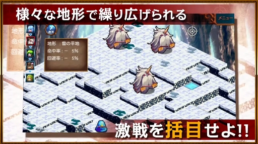 クォータービューで展開するシミュレーションバトルをどのように進めるか、戦術はすべてあなた次第。マップの高低差や攻撃方向、各キャラの行動範囲や攻撃特徴を考え、敵の動きを予測しながら、緻密な戦略を組み立てていきましょう。場所によって異なる回避率、異なる攻撃範囲や命中率、考える要素は多彩です。