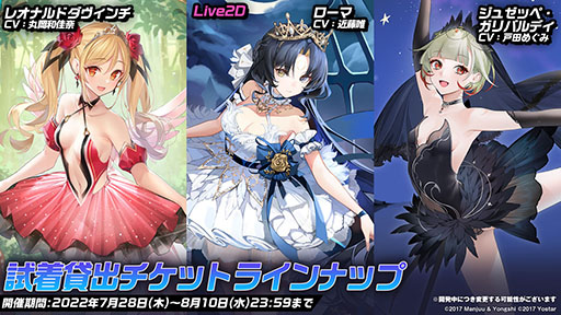 新作の着せ替えも登場する。今回対象となるのはローマ,レオナルド・ダ・ヴィンチ,ジュゼッペ・ガリバルディ,アルフレード・オリアーニ,ボルツァーノと,「三隈」「熊野」「サンフランシスコ」「大鳳」ら実装済みのものを含む合計9名だ。これらのうち,ローマと大鳳はLive2Dに対応する。