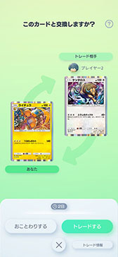 トレードはフレンド同士で行います。◆1〜◆4、★1の同じレアリティ同士のカードで、アイテム等を消費することによりトレードすることができます。交換できるカードは、機能追加時点では「最強の遺伝子」と「幻のいる島」に収録される一部のカードです。交換できるカードのラインナップは今後も随時アップデートを検討しています。