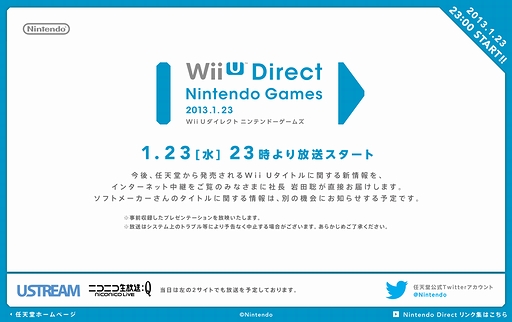 任天堂は,同社の代表取締役社長 岩田 聡氏によるプレゼンテーション録画映像「Wii U Direct Nintendo Games 2013.1.23」を,本日(2013年1月23日)23:00より配信することを明らかにした。