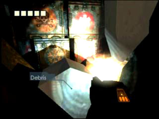 | 画面左と中央はそれぞれ,ヘルスを回復,または最大値を増やすための装置だ。敵の死体を始めオブジェクトへの干渉性も高く,画面右のように瓦礫を押しのけて前に進むこともある |